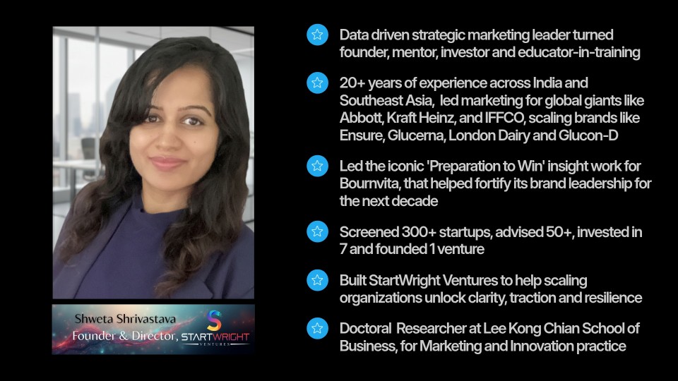 Founded by business leader Shweta Shrivastava, StartWright brings 25 years of corporate experience, startup agility and academic rigour with a deep understanding of innovation, brand building and AI‑driven execution.